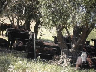 Funny, while I was taking this picture, I heard some odd noises behind me. From across the road. Sort of a chewing noise. A whooshing noise. And ... a rustle. I turned around... and there they were. Cattle. Hanging out under the nearest oaks. Probably the only oaks they can find.
